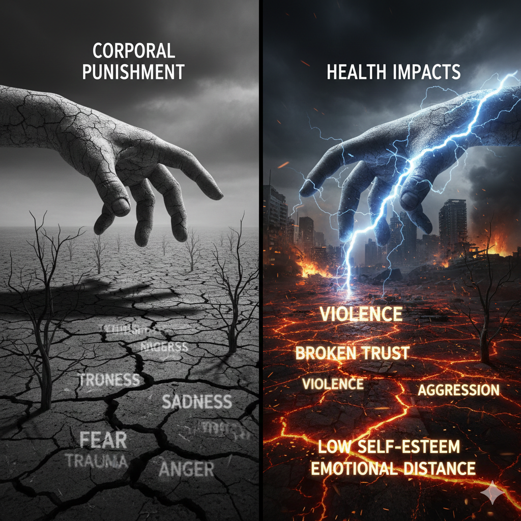 - ශාරීරික හා මානසික රෝග, දුර්වල වූ සංජානන හා සමාජ-චිත්තවේගීය වර්ධනය, දුර්වල අධ්යාපනික ප්රතිඵල, ආක්රමණශීලී බව සහ ප්රචණ්ඩත්වය වැඩි කිරීම ඇතුළු ළමුන් සඳහා ඍණාත්මක ප්රතිඵල රාශියකට ශාරීරික දඬුවම් සම්බන්ධ වේ.