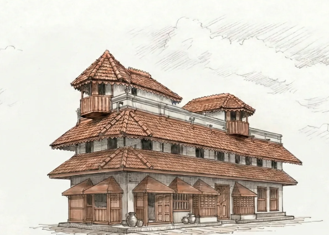 - වහලය: ‘පෙති උළු’ ලෙස හඳුන්වන කුඩා මැටි උළු සෙවිලි කර ඇත.